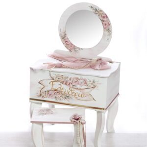 Διάσταση Κουτιού (Υ.85 Μ.50 Π.35)Το σετ περιλαμβάνει:✔ Ξύλινο μπουντουάρ-κουτί βάπτισης με καθρέφτη, ζωγραφισμενο στο χέρι.