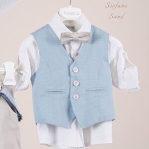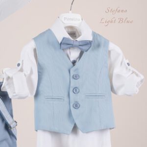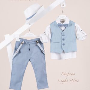 Περιλαμβάνει κλασάτο βαμβακερό γιλέκο, πουκάμισο λινό, παντελόνι βαμβακερό σε χρώμα Light Blue, παπιγιόν, τιράντες και καπέλο με φάσα.