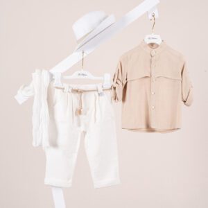 Περιλαμβάνει κλασάτο βαμβακερό γιλέκο, πουκάμισο λινό, παντελόνι βαμβακερό σε χρώμα Sand, παπιγιόν, τιράντες και καπέλο με φάσα.