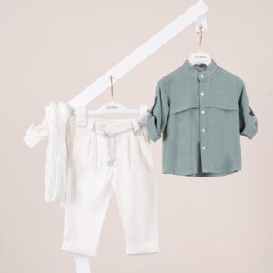 Περιλαμβάνει λινή πουκαμίσα σε ιδιαίτερο κόψιμο με πιέτα, παντελόνι λινό μέ πιέτες σε λευκό χρώμα, ζωνάκι από βαμβακερό κορδόνι και φουλάρι.
