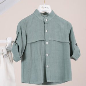 Περιλαμβάνει λινή πουκαμίσα σε ιδιαίτερο κόψιμο και παντελόνι λινό με πιέτες.