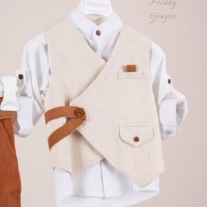 Περιλαμβάνει λινό γιλέκο λοξό με κουμπωμα σε ιμάντα, πουκάμισο μαο λευκό βαμβακερό, παντελόνι λινό με πιέτες σε χρώμα Ginger, ζώνη και καπέλο με