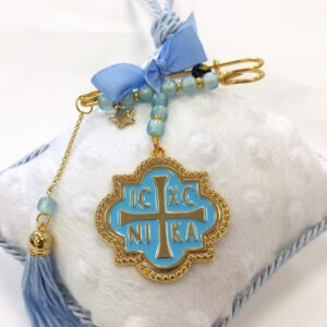Ένα μοναδικό δωρό για νεογένητο! Ένα δώρο που θα μείνει για πάντα! Για τις μικρές πολύτιμες στιγμές σας! Μεταλλικό Κωνσταντινάτο πάνω σε παραμάνα με σιελ εντυπωσιακη φούντα και δεμμενο πανω σε λευκό μαξιλαράκι