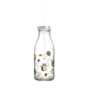 Γυάλινο μπουκάλι εκτυπωμένο με θέμα Ζωάκια του δάσουςκαι μεταλλικό καπάκι διαφόρων χρωμάτων με τρύπα Φ7 cm για καλαμάκι. Στη συσκευασία περιλαμβάνεται ημιδιάφανο πλαστικό καλαμάκι μίας χρήσης.