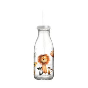 Γυάλινο μπουκάλι εκτυπωμένο με θέμα Cute jungle animalsκαι μεταλλικό καπάκι διαφόρων χρωμάτων με τρύπα Φ7 cm για καλαμάκι. Στη συσκευασία περιλαμβάνεται ημιδιάφανο πλαστικό καλαμάκι μίας χρήσης.