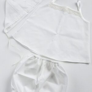 Ρομαντικό και φινετσάτο βαμβακερό σετ λαδόπανων σε εκρού χρώμα με φάσα από γαλλική δαντέλα είκοσι πόντων και σατέν κορδέλα με φίογκο.