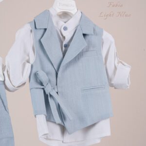 Περιλαμβάνει λινό γιλέκο με δέσιμο στο πλάι, πουκάμισο λινό με μάο γιακά, παντελόνι λινό με πιέτες σε χρώμα Light Blue, ζωνάκι με double D δέσιμο