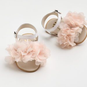 Σανδάλι για τα πρώτα βήματα σε εκρού περλέ δέρμα διακοσμημένο με τούλι και λουλούδι σε dusty pink.