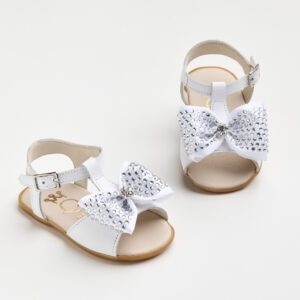 K625A (Νο 18-21) Σανδάλι για τα πρώτα βήματα σε λευκό δέρμα και χειροποίητο φιόγκο με στρας