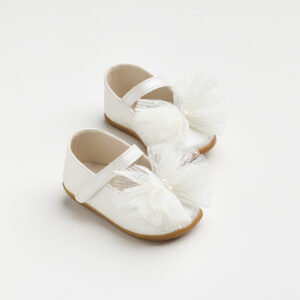 Μπαλαρίνα για τα πρώτα βήματα από λευκό δέρμα με διακόσμηση από σατέν φιόγκο και φτερά.