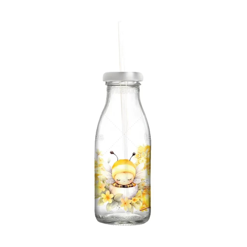 Γυάλινο μπουκάλι εκτυπωμένο με θέμα Baby beeκαι μεταλλικό καπάκι διαφόρων χρωμάτων με τρύπα Φ7 cm για καλαμάκι. Στη συσκευασία περιλαμβάνεται ημιδιάφανο πλαστικό καλαμάκι μίας χρήσης.