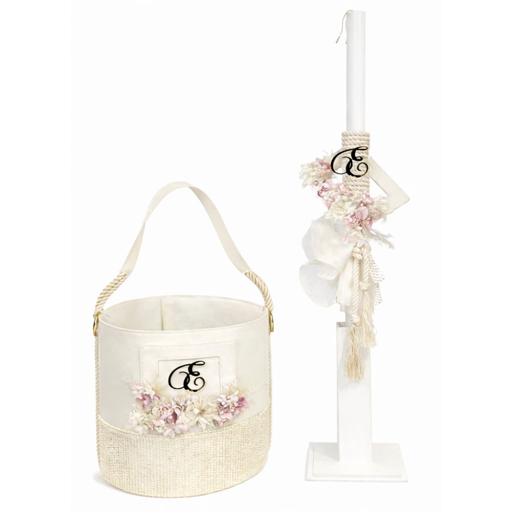 Συνοδεύεται απο λαμπάδα στολισμένη με υφάσματα στα ίδια υπεροχα χρώματα και με μια ιδιαίτερη χειροποίητη ονειροπαγίδα.