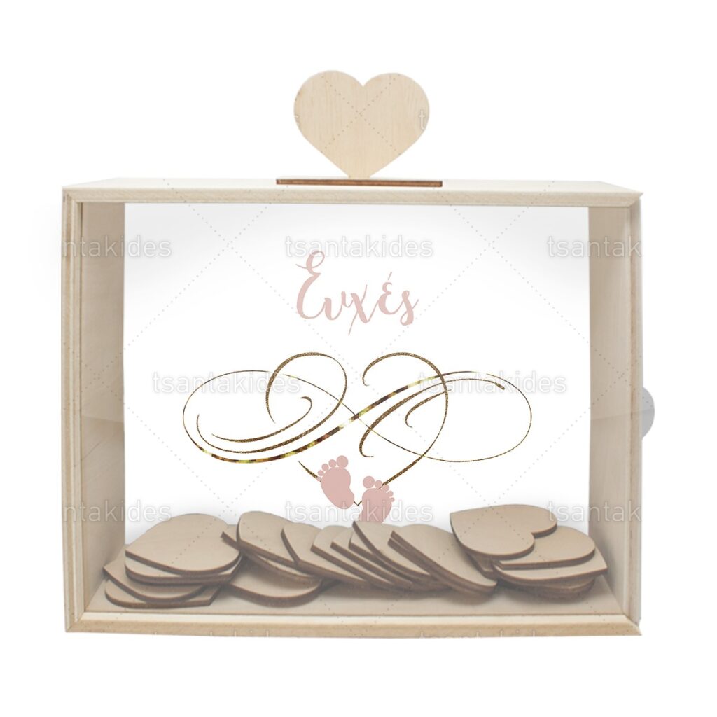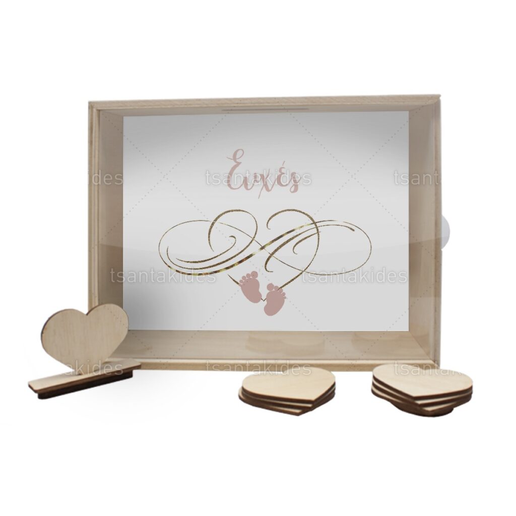Ξύλινο κουτί ευχών γάμου εκτυπωμένο με το σύμβολο του άπειρου και τα bebe πατουσάκια