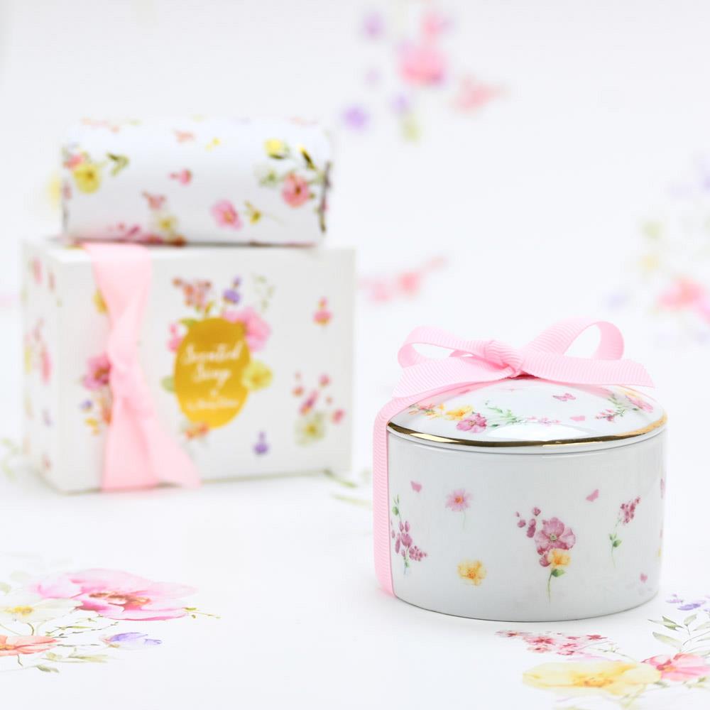Η συσκευασία είναι στολισμένη με ένα χαρούμενο, λουλουδάτο μοτίβο σε ροζ, κίτρινες και λιλά αποχρώσεις, αποδίδοντας την αίσθηση ενός ανοιξιάτικου κήπου που ανθίζει. Κομψό και ρομαντικό, αποτελεί ιδανική πρόταση για δώρο αλλά και μια εξαιρετική επιλογή για μπομπονιέρα γάμου ή βάπτισης που θα μείνει αξέχαστη στους καλεσμένους σας.
