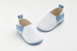 A600P παπουτσάκι αγκαλιάς σε λευκό δέρμα και γαλάζιο καστόρ, κλείσιμο με Velcro