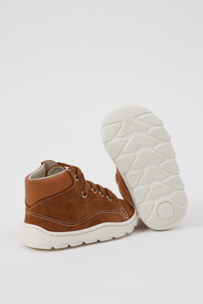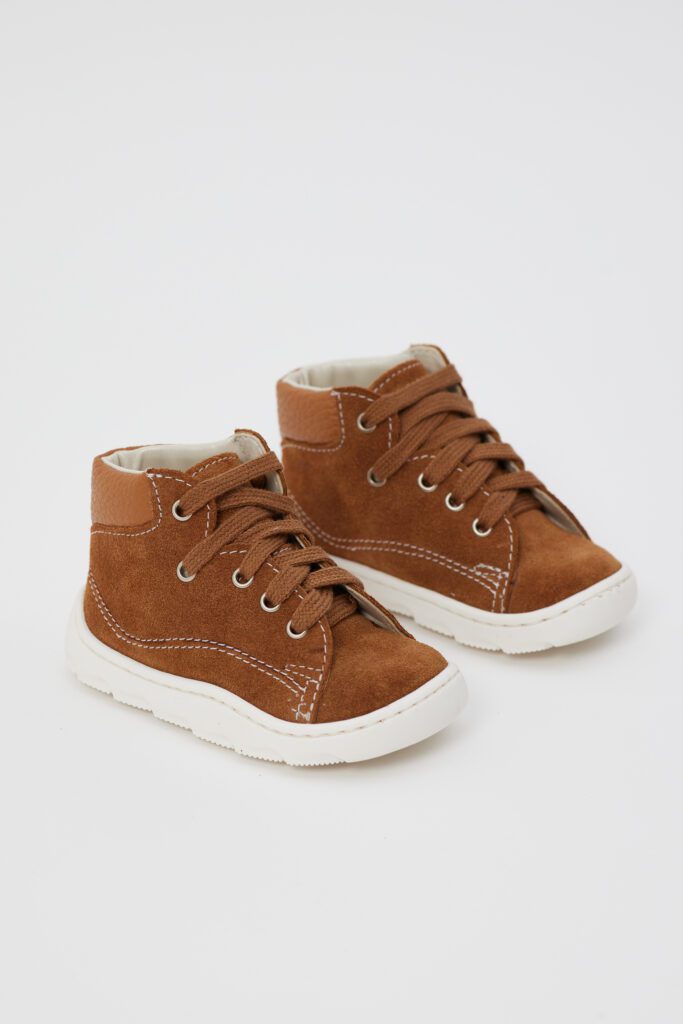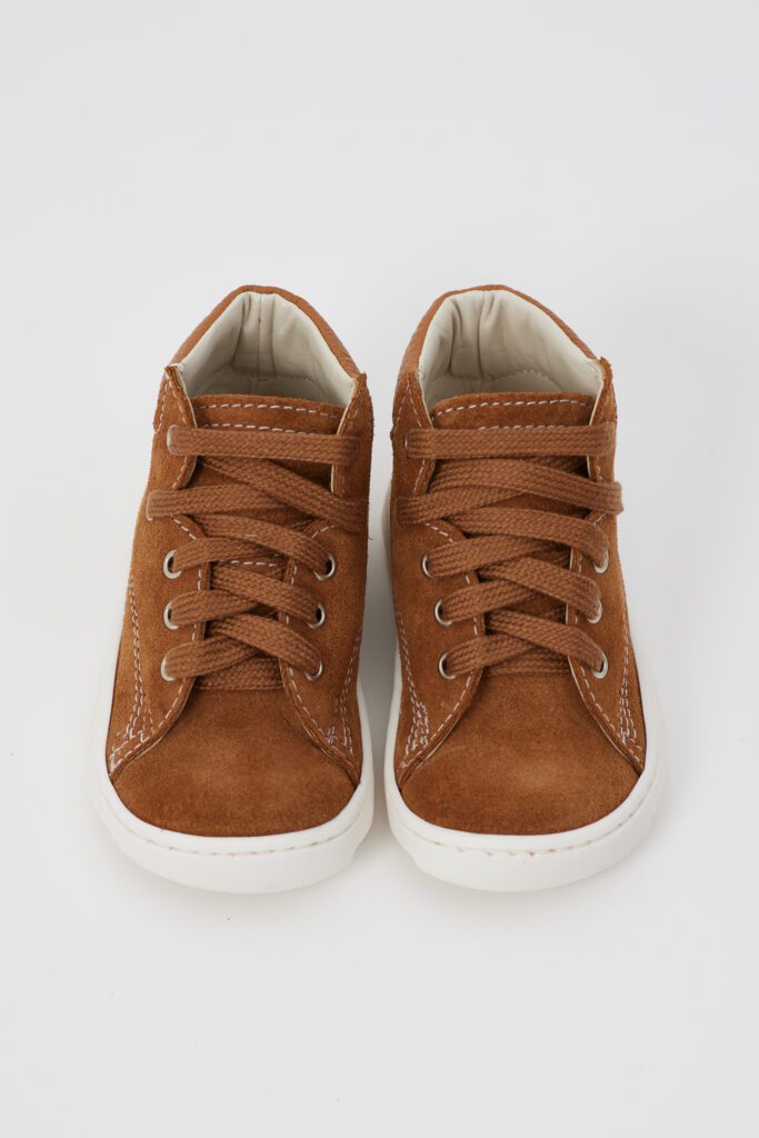 Παπουτσάκι αγκαλιάς sneaker σε μπεζ καστόρ δέρμα και λαδί ύφασμα.