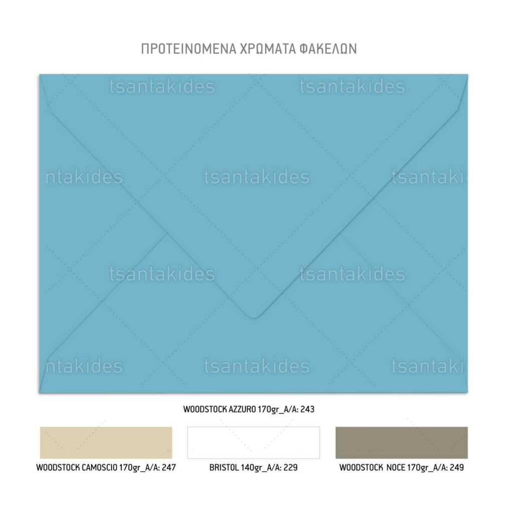 ο προσκλητήριο διαθέτει φάκελο διάστασης 19,5X14,5 cm σε μπλε ματ χαρτί.