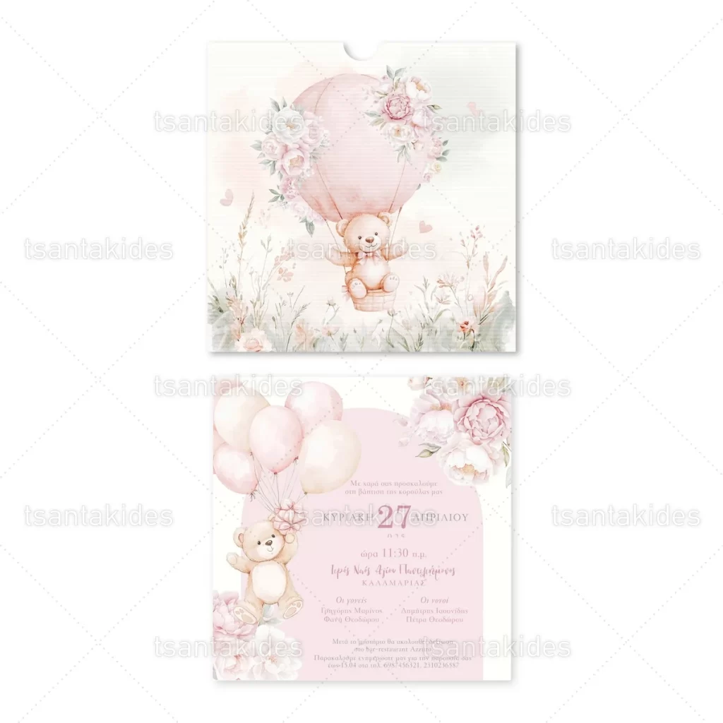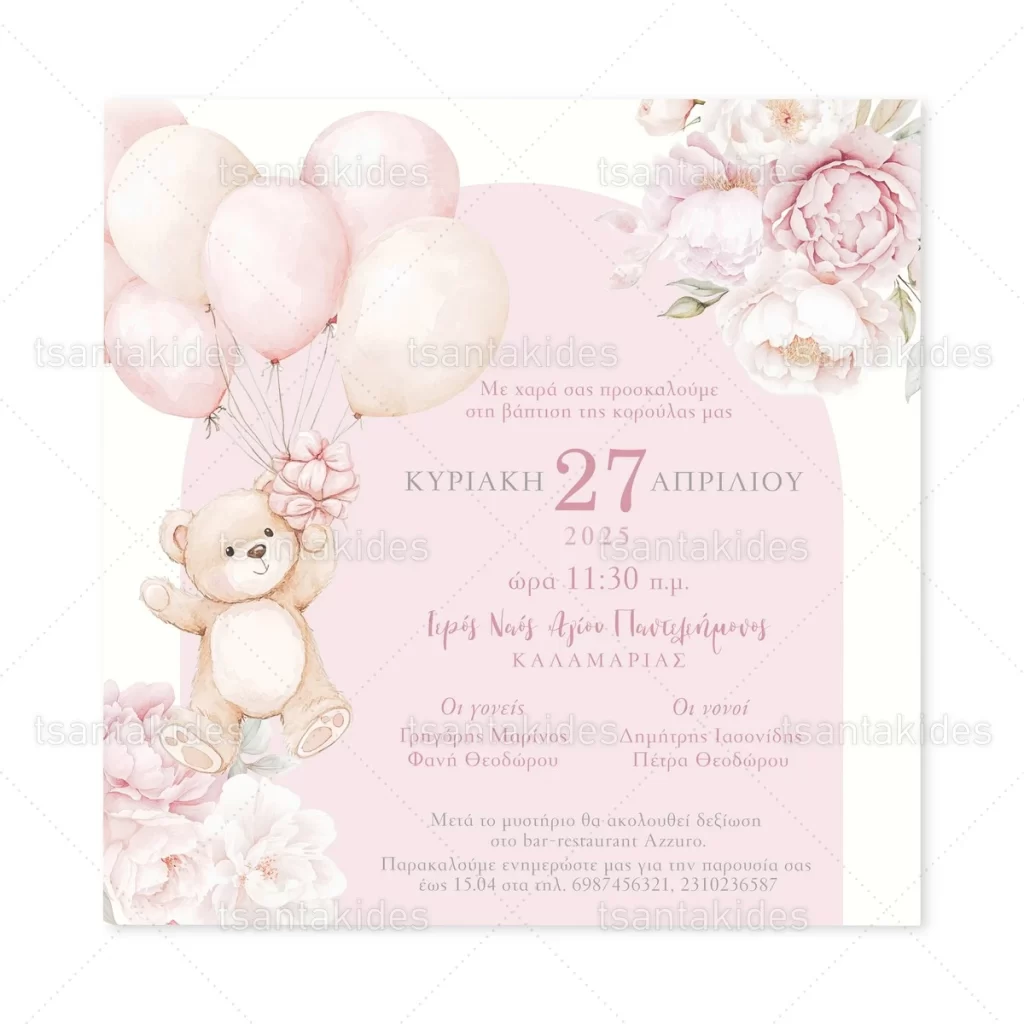 Προσκλητήριο βάπτισης για κορίτσι εκτυπωμένο με θέμα Pink Teddy Bear