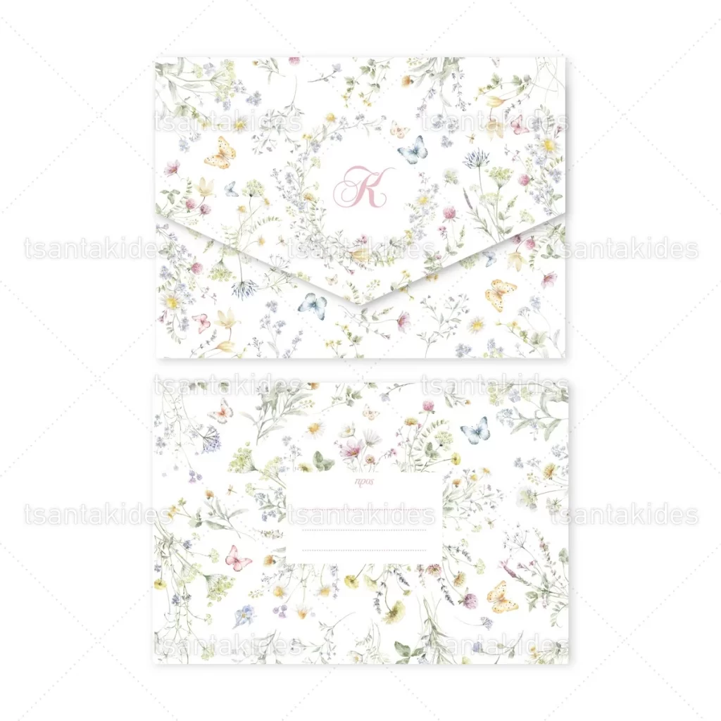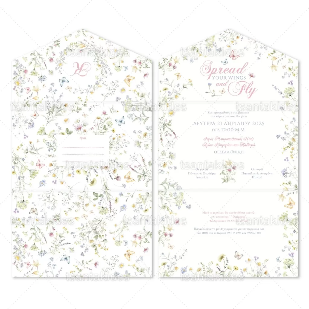 Προσκλητήριο βάπτισης για κορίτσι εκτυπωμένο με θέμα Wildflowers & Butterflies