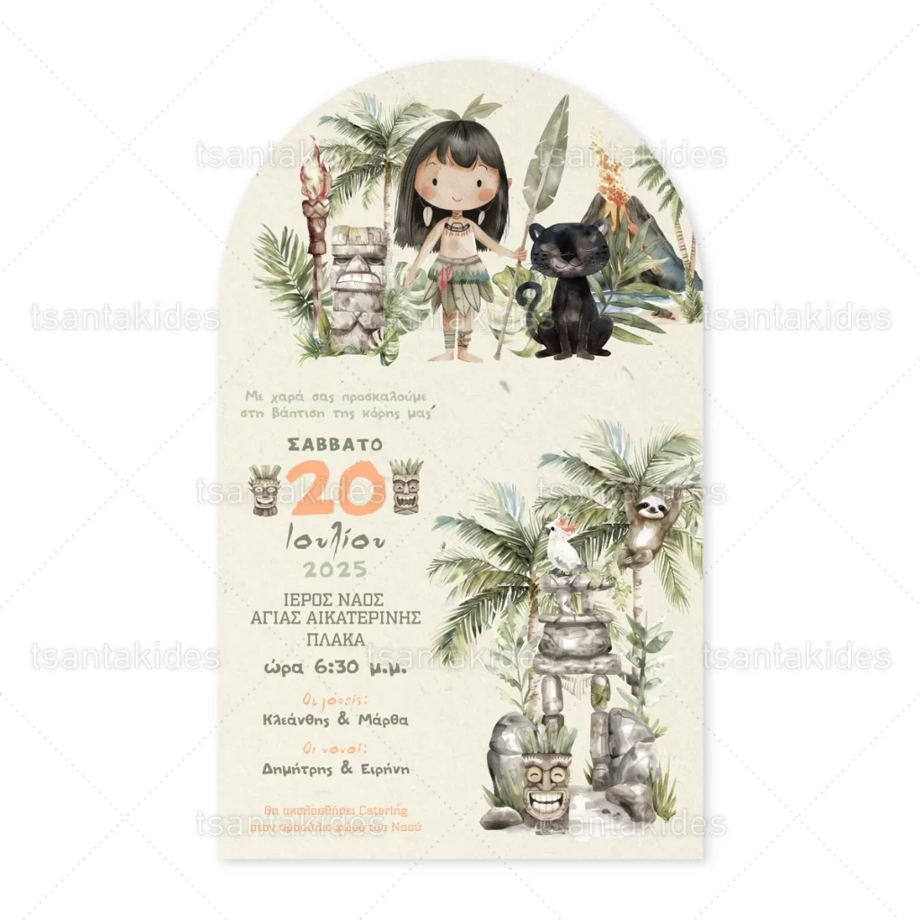 Προσκλητήριο βάπτισης για κορίτσι εκτυπωμένο με θέμα Tiki Tales