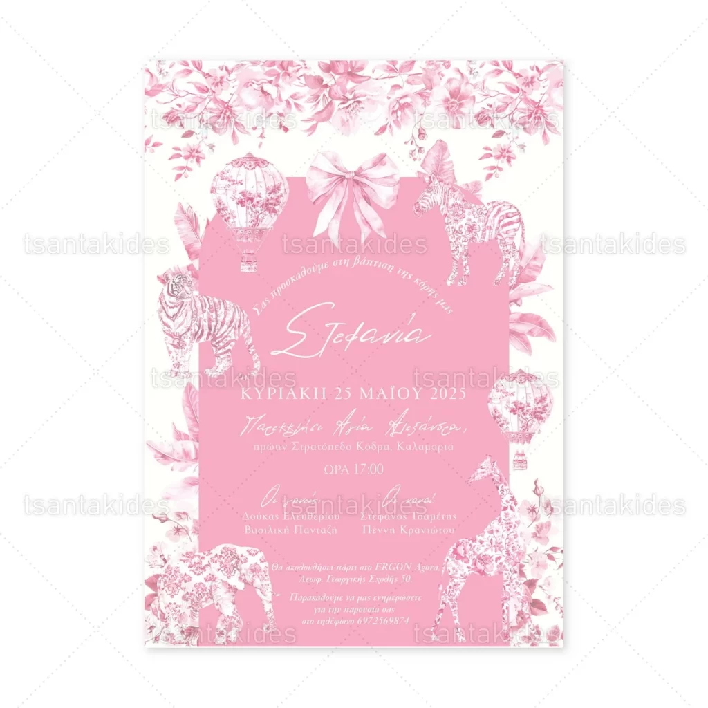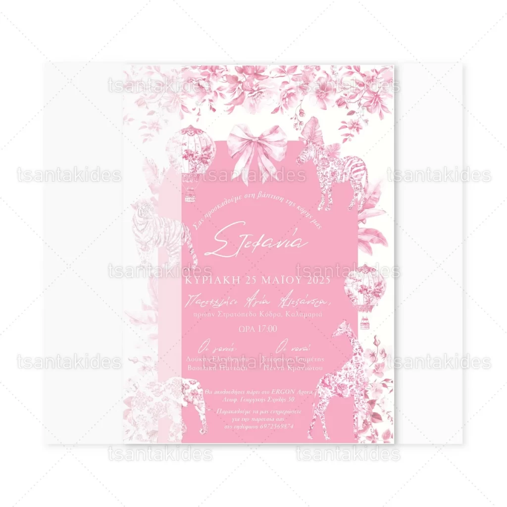 Προσκλητήριο βάπτισης για κορίτσι εκτυπωμένο με θέμα Pink Jungle Toile
