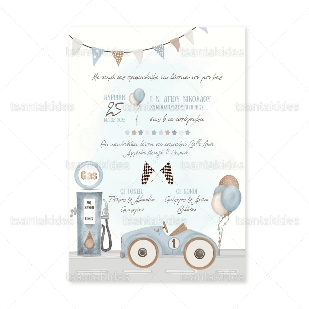 Προσκλητήριο βάπτισης για Αγόρι εκτυπωμένο με θέμα Blue Racing Cars
