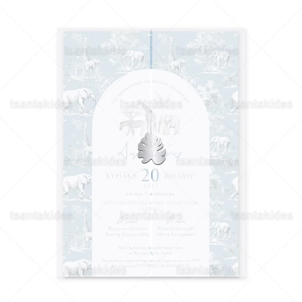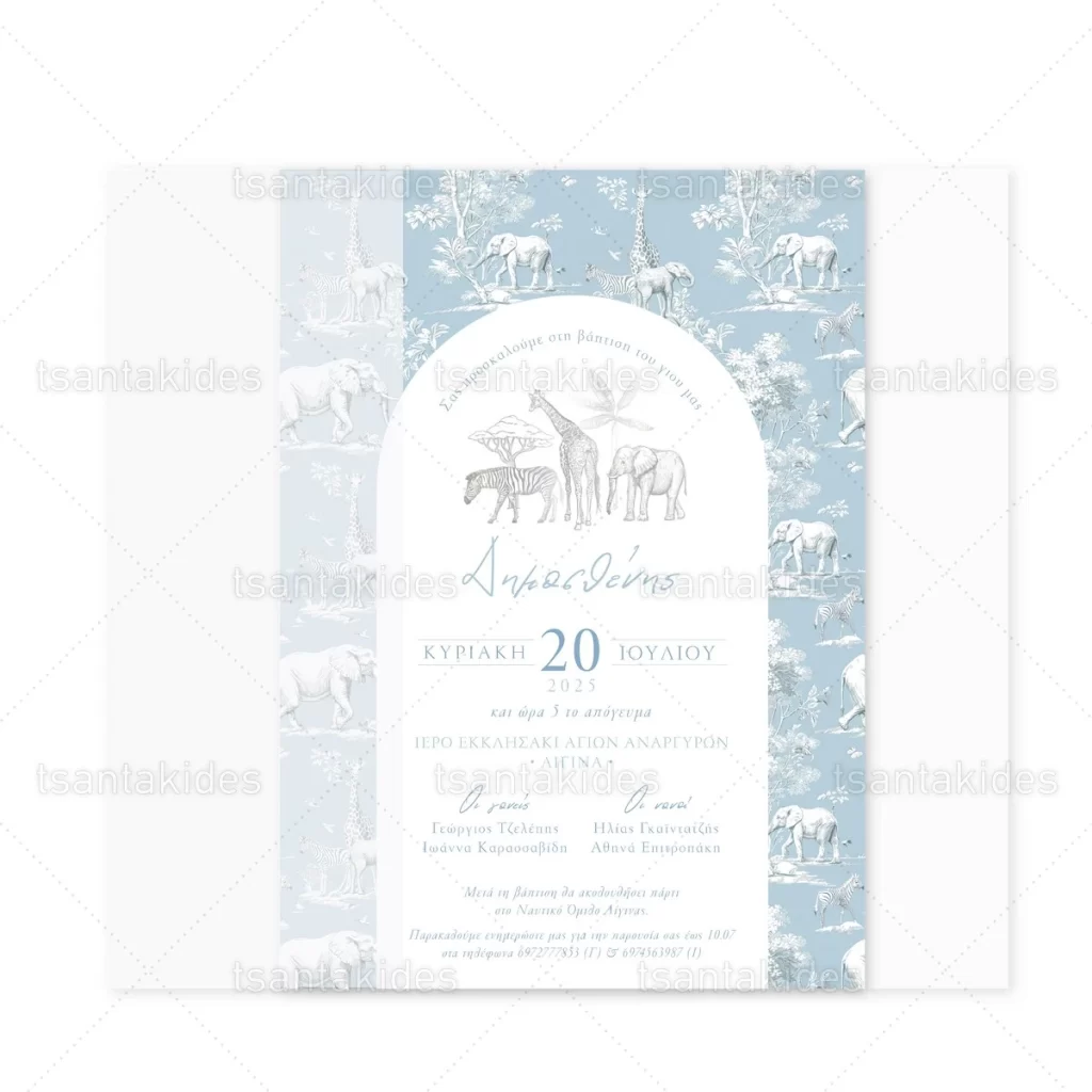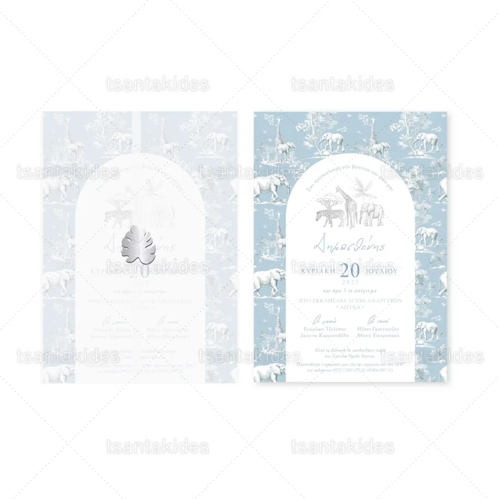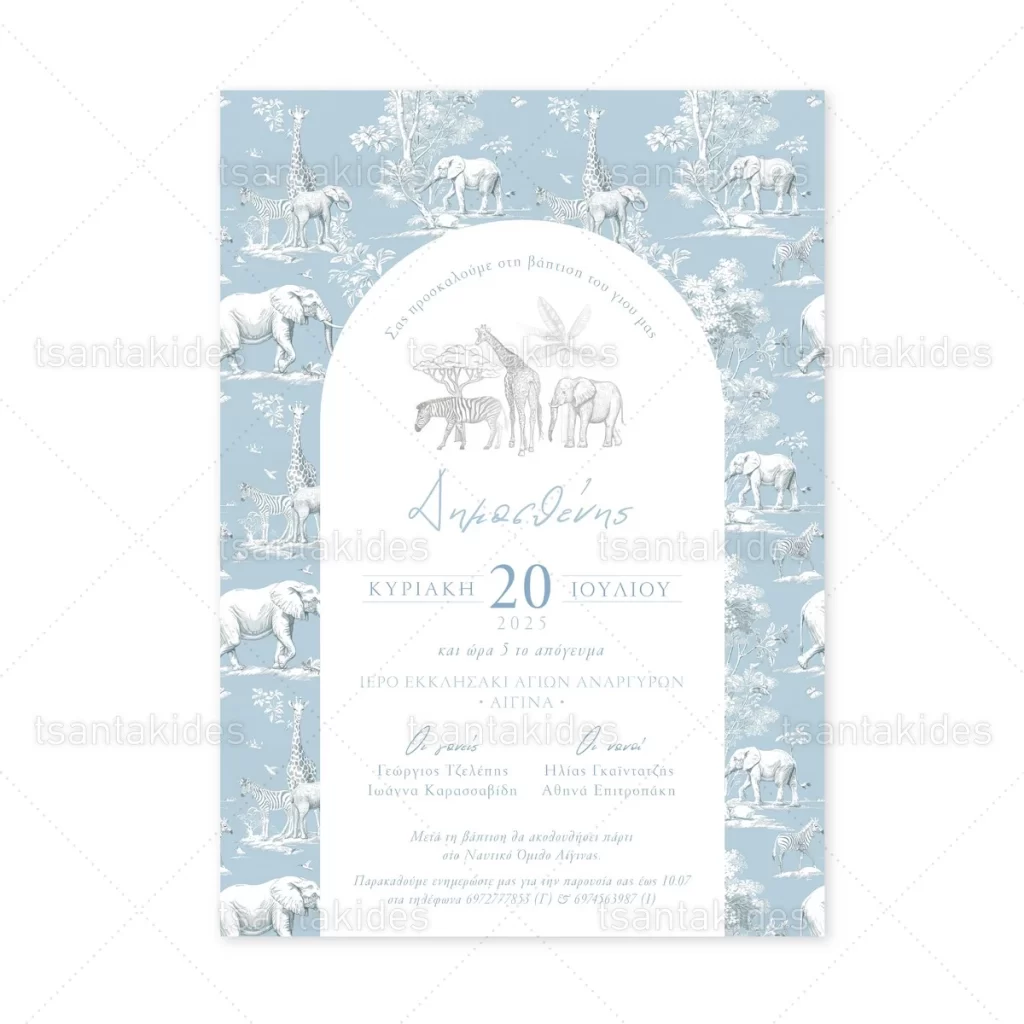 Προσκλητήριο βάπτισης για αγόρι εκτυπωμένο με θέμα Dusty Blue Jungle Toile