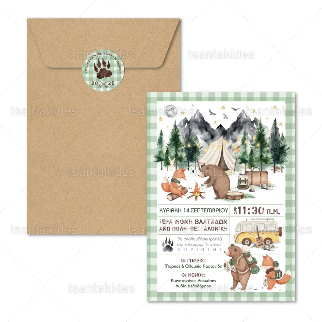 Προσκλητήριο βάπτισης για αγόρι εκτυπωμένο με θέμα Camping