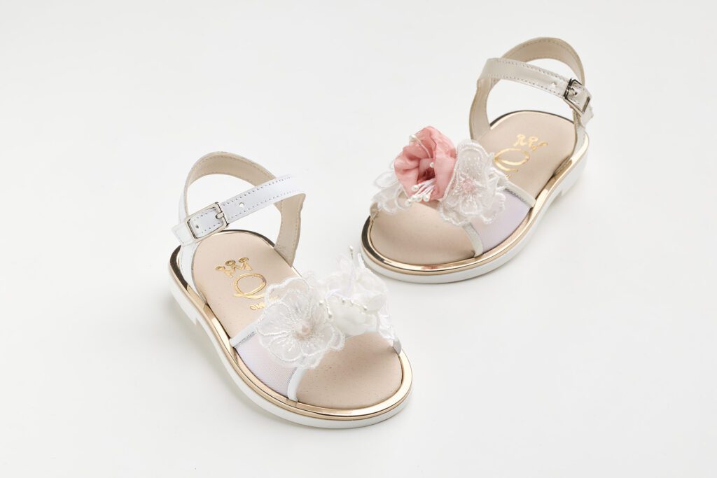 K645E (19 – 27) Σανδάλι περπατήματος σε εκρού δέρμα και διαφάνεια με χειροποίητα λουλούδια σε