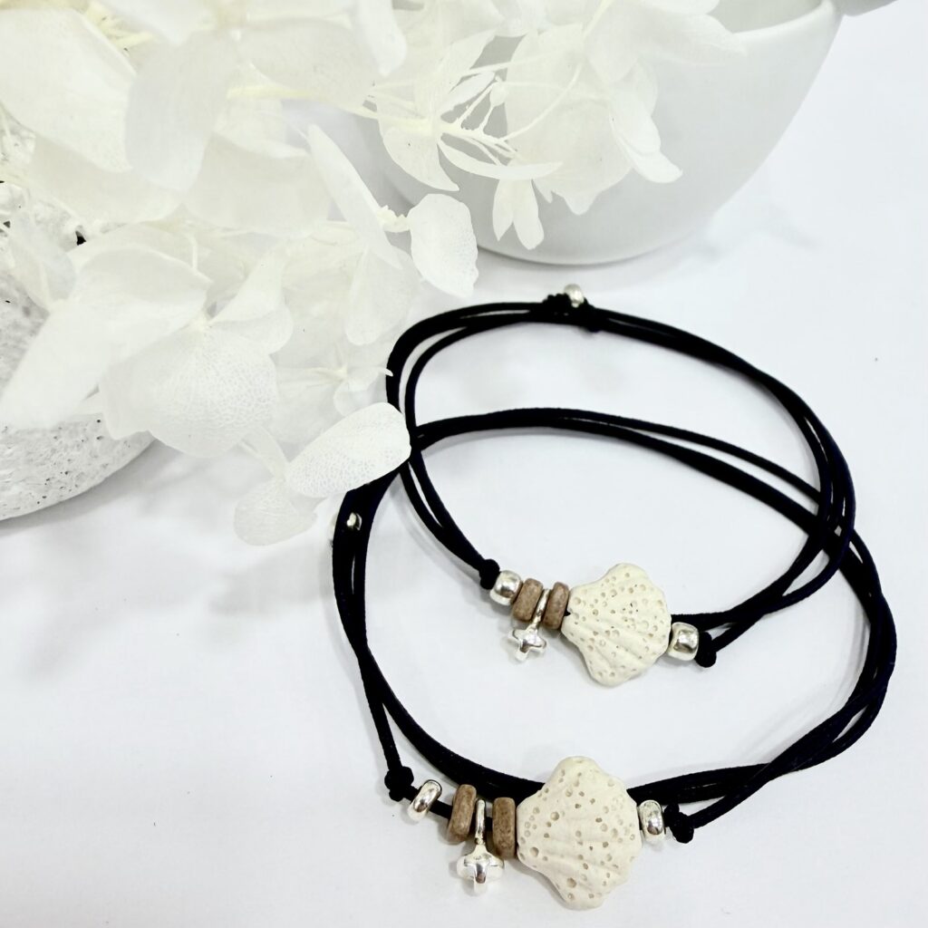 Βραχιόλι με ελαστικό κορδόνι ,λάβα κοχύλι και επάργυρο σταυρό.