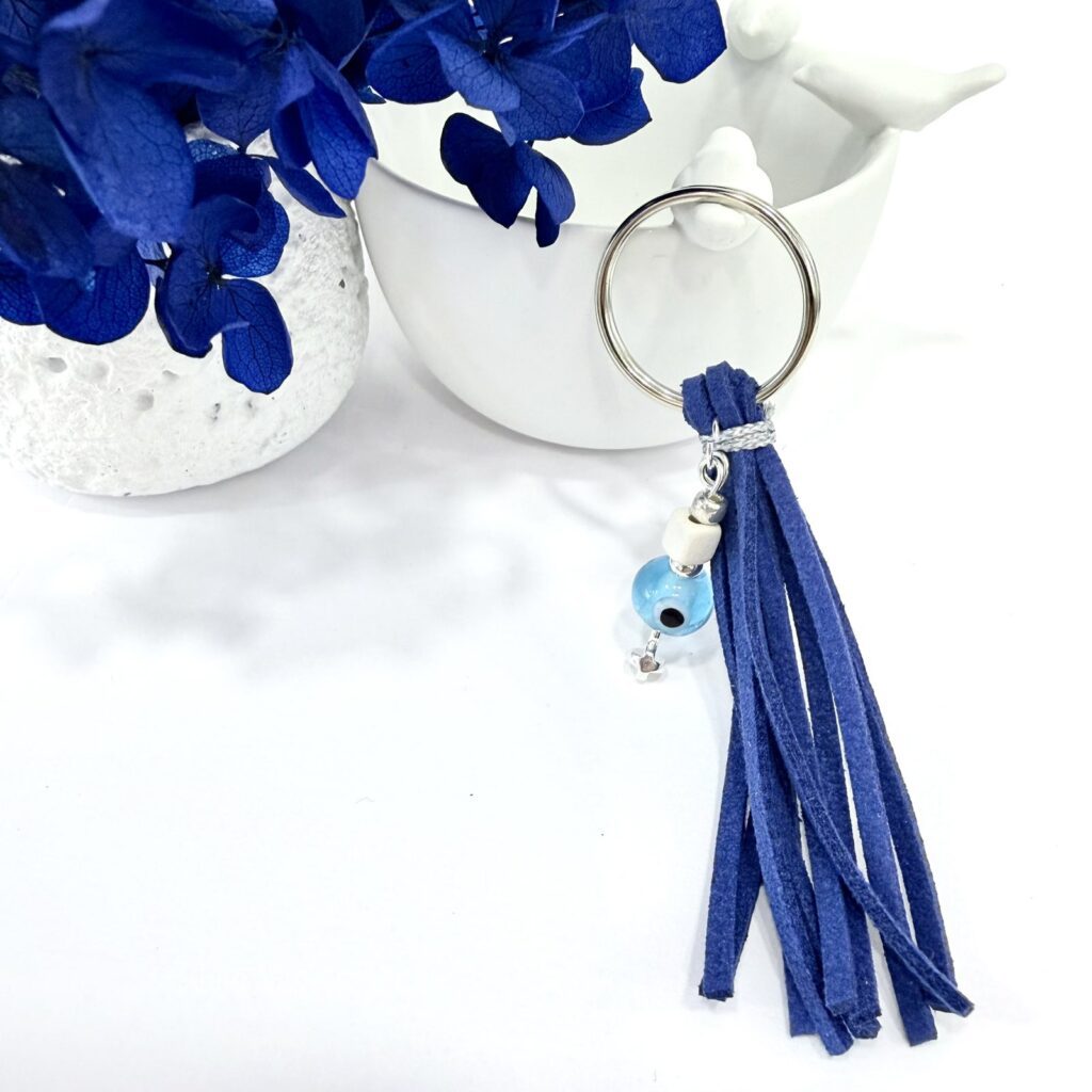 Μπρελόκ σουέτ με γυάλινο ματάκι και επάργυρο σταυρό.