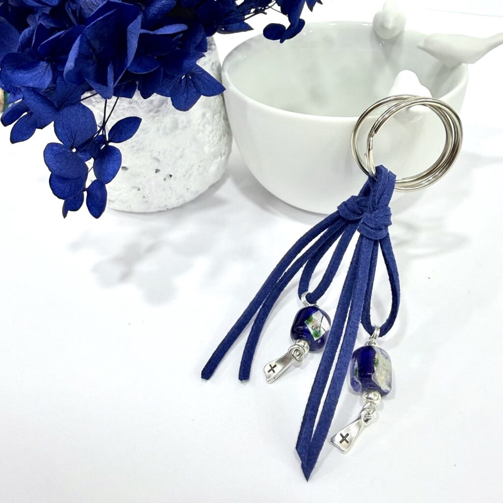 Μπρελόκ σουέτ με γυαλωμένη χάντρα και επάργυρο σταυρό.