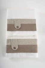 Λαδόπανα βάπτισης Κομπολόι | Beads από την εταιρία Lina Baby Βαμβακερό σετ  λαδόπανου σε Λευκό και Ιβουάρ χρώμα  με διακοσμητική τρέσα σε Μπλέ και Μπέζ (αντίστοιχα) και φουντίτσα με λευκή ξύλινη χάντρα.    Το σετ περιλαμβάνει, πετσέτα μεγάλη, λαδόπανο, μικρή πετσέτα και εσώρουχα. • Πετσέτα 100% βαμβακερή διαστάσεων 90*140*450g. OEKO-TEX STANDARD 100 • Πετσέτα παπά 100% βαμβακερή διαστάσεων ραμμένη 30×50 Υπάρχει η δυνατότητα γραφής του ονόματος του παιδιού με κέντημα, ίδιων αποχρώσεων με το λαδόπανο με έξτρα χρέωση. Με κέντημα ενός ονόματος +20ευρώ. Με κέντημα δύο ονομάτων +30ευρω.