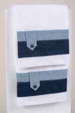 Για τους λάτρεις των Παστέλ αποχρώσεων αυτό το σετ λαδόπανων είναι το καταλλήλότερο. Σε λευκή Βαμβακερή απόχρωση διακοσμημένο απο τρέσες χρωμάτος μπεζ και σιέλ μελανζέ. Ολες οι πετσέτες της Lina Baby φέρουν την ετικέτα STANDARD 100 by OEKO-TEX® (Αυτό σημαίνει ότι τα προϊόντα δεν περιέχουν επιβλαβή επίπεδα χημικών ουσιών.)       Το σετ περιλαμβάνει, πετσέτα μεγάλη, λαδόπανο, μικρή πετσέτα και εσώρουχα. • Πετσέτα 100% βαμβακερή διαστάσεων 70*140*400g. OEKO-TEX STANDARD 100 • Πετσέτα παπά 100% βαμβακερή διαστάσεων ραμμένη 30×50 Υπάρχει η δυνατότητα γραφής του ονόματος του παιδιού με κέντημα, ίδιων αποχρώσεων με το λαδόπανο με έξτρα χρέωση. Με κέντημα ενός ονόματος +20ευρώ. Με κέντημα δύο ονομάτων +30ευρω.