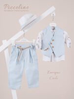 Περιλαμβάνει γιλέκο με διπλή μόστρα σε διχρωμία, πουκάμισο λινό, παντελόνι λινό με πιέτες σε χρώμα Beige, παπιγιόν, ζώνη και καπέλο με φάσα. Διαθέσιμο σε 4 μεγέθη 6-12, 12-18, 18-24, 24-36(εξτρά χρέωση)