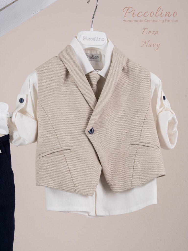 Βαπτιστικό κοστούμι Piccolino Mateo σε χρώμα capuccino. Περιλαμβάνει γιλέκο μονόκουμπο, πουκάμισο με γιακά μαο λινό εκρού, παντελόνι σε χρώμα capuccino, φουλάρι, ζώνη και καπέλο με φάσα. Διαθέσιμο σε 4 μεγέθη 6-12, 12-18, 18-24, 24-36(εξτρά χρέωση) Επωθεληθείτε την προσφοράς μας και δημιουργήστε ένα ολοκληρωμένο πακέτο βάπτισης που περιλαμβάνει