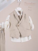 Βαπτιστικό κοστούμι Piccolino Luciano σε χρώμα Sand. Περιλαμβάνει γιλέκο μονόκουμπο, πουκάμισο με γιακά μαο λινό εκρού, παντελόνι σε χρώμα ivory, ζώνη με double D δέσιμο και καπέλο με φάσα. Διαθέσιμο σε 4 μεγέθη 6-12, 12-18, 18-24, 24-36(εξτρά χρέωση) Επωθεληθείτε την προσφοράς μας και δημιουργήστε ένα ολοκληρωμένο πακέτο βάπτισης που περιλαμβάνει