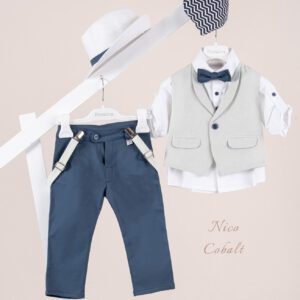 Περιλαμβάνει γιλέκο με διπλή μόστρα σε διχρωμία, πουκάμισο λινό, παντελόνι λινό με πιέτες σε χρώμα Mocha, παπιγιόν, ζώνη και καπέλο με φάσα.