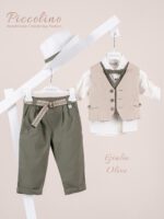Βαπτιστικό κοστούμι απτιστικό κοστούμι Piccolino Enzo σε χρώμα Golden Olive. Περιλαμβάνει γιλέκο σταυρωτό με μύτη μονόκουμπο, πουκάμισο λινό, παντελόνι λινό με πιέτες σε χρώμα Golden Olive, γραβάτα, φουλάρι λινό με δέσιμο σε ίδια απόχρωση με το παντελόνι, ζωνάκι με double D δέσιμο και καπέλο με φάσα. Διαθέσιμο σε 4 μεγέθη 6-12, 12-18, 18-24, 24-36(εξτρά χρέωση) Επωθεληθείτε την προσφοράς μας και δημιουργήστε ένα ολοκληρωμένο πακέτο βάπτισης που περιλαμβάνει