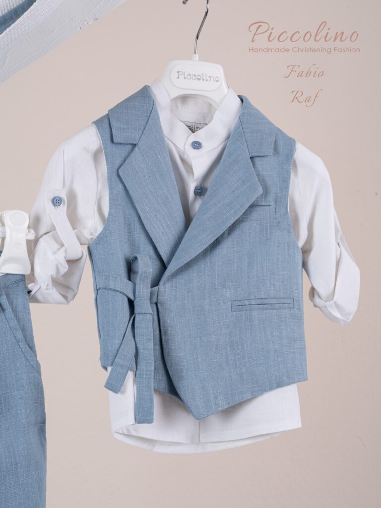 Βαπτιστικό κοστούμι Piccolino Enrique σε χρώμα Ciele. Περιλαμβάνει λινό γιλέκο με μύτη ξύλινα κουμπιά και διακοσμητικό κρεμαστό με χάντρες, πουκάμισο λινό με γιακά μαο, παντελόνι λινό σε χρώμα Teal, ζωνάκι με double D δέσιμο και καπέλο με φάσα. Διαθέσιμο σε 4 μεγέθη 6-12, 12-18, 18-24, 24-36(εξτρά χρέωση) Επωθεληθείτε την προσφοράς μας και δημιουργήστε ένα ολοκληρωμένο πακέτο βάπτισης που περιλαμβάνει