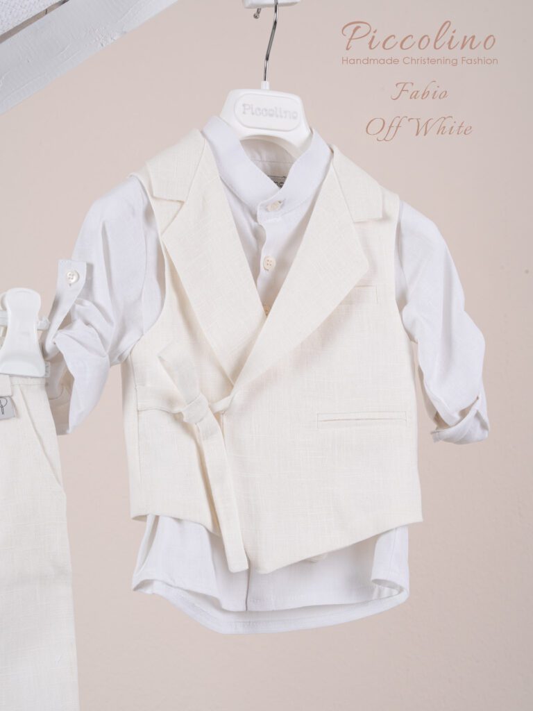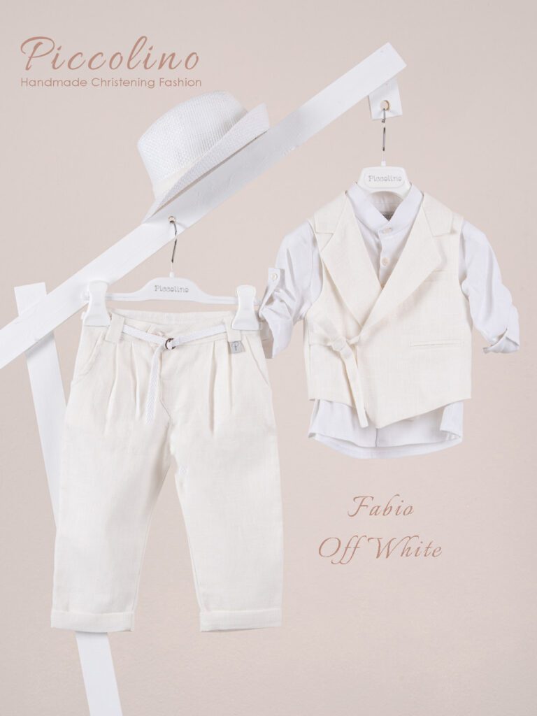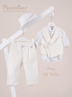 Βαπτιστικό κοστούμι Piccolino Enzo σε χρώμα Beige. Περιλαμβάνει γιλέκο σταυρωτό με μύτη μονόκουμπο, πουκάμισο λινό, παντελόνι λινό με πιέτες σε χρώμα Beige, γραβάτα, φουλάρι λινό με δέσιμο σε ίδια απόχρωση με το παντελόνι, ζωνάκι με double D δέσιμο και καπέλο με φάσα. Διαθέσιμο σε 4 μεγέθη 6-12, 12-18, 18-24, 24-36(εξτρά χρέωση) Επωθεληθείτε την προσφοράς μας και δημιουργήστε ένα ολοκληρωμένο πακέτο βάπτισης που περιλαμβάνει