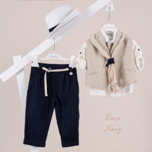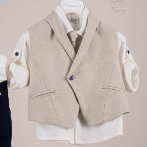 Περιλαμβάνει γιλέκο με διπλή μόστρα σε διχρωμία, πουκάμισο λινό, παντελόνι λινό με πιέτες σε χρώμα Beige, παπιγιόν, ζώνη και καπέλο με φάσα. Διαθέσιμο σε 4 μεγέθη 6-12, 12-18, 18-24, 24-36(εξτρά χρέωση)