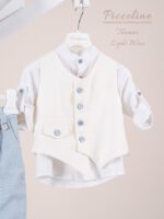 Βαπτιστικό κοστούμι Piccolino Enrique σε χρώμα Ciele. Περιλαμβάνει λινό γιλέκο με μύτη ξύλινα κουμπιά και διακοσμητικό κρεμαστό με χάντρες, πουκάμισο λινό με γιακά μαο, παντελόνι λινό σε χρώμα Teal, ζωνάκι με double D δέσιμο και καπέλο με φάσα. Διαθέσιμο σε 4 μεγέθη 6-12, 12-18, 18-24, 24-36(εξτρά χρέωση) Επωθεληθείτε την προσφοράς μας και δημιουργήστε ένα ολοκληρωμένο πακέτο βάπτισης που περιλαμβάνει