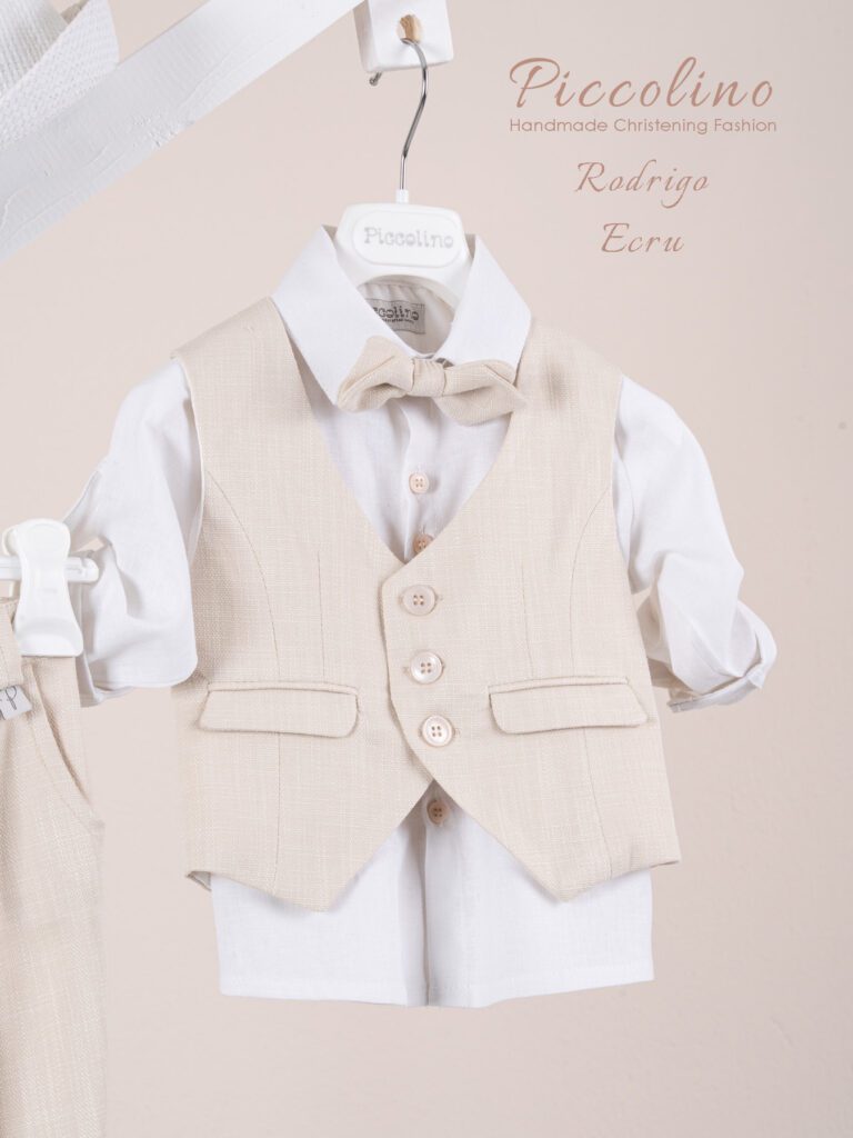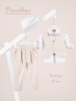 Βαπτιστικό κοστούμι Piccolino Luciano σε χρώμα Sand. Περιλαμβάνει γιλέκο μονόκουμπο, πουκάμισο με γιακά μαο λινό εκρού, παντελόνι σε χρώμα ivory, ζώνη με double D δέσιμο και καπέλο με φάσα. Διαθέσιμο σε 4 μεγέθη 6-12, 12-18, 18-24, 24-36(εξτρά χρέωση) Επωθεληθείτε την προσφοράς μας και δημιουργήστε ένα ολοκληρωμένο πακέτο βάπτισης που περιλαμβάνει