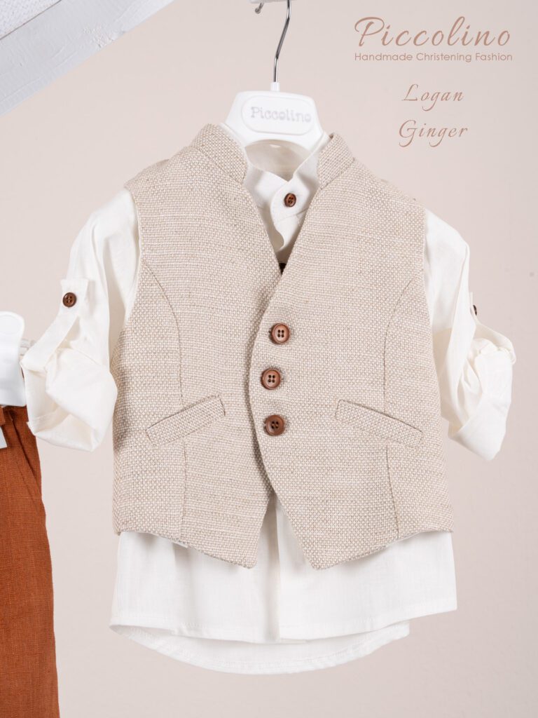 Βαπτιστικό κοστούμι Piccolino Enzo σε χρώμα Beige. Περιλαμβάνει γιλέκο σταυρωτό με μύτη μονόκουμπο, πουκάμισο λινό, παντελόνι λινό με πιέτες σε χρώμα Beige, γραβάτα, φουλάρι λινό με δέσιμο σε ίδια απόχρωση με το παντελόνι, ζωνάκι με double D δέσιμο και καπέλο με φάσα. Διαθέσιμο σε 4 μεγέθη 6-12, 12-18, 18-24, 24-36(εξτρά χρέωση) Επωθεληθείτε την προσφοράς μας και δημιουργήστε ένα ολοκληρωμένο πακέτο βάπτισης που περιλαμβάνει