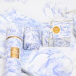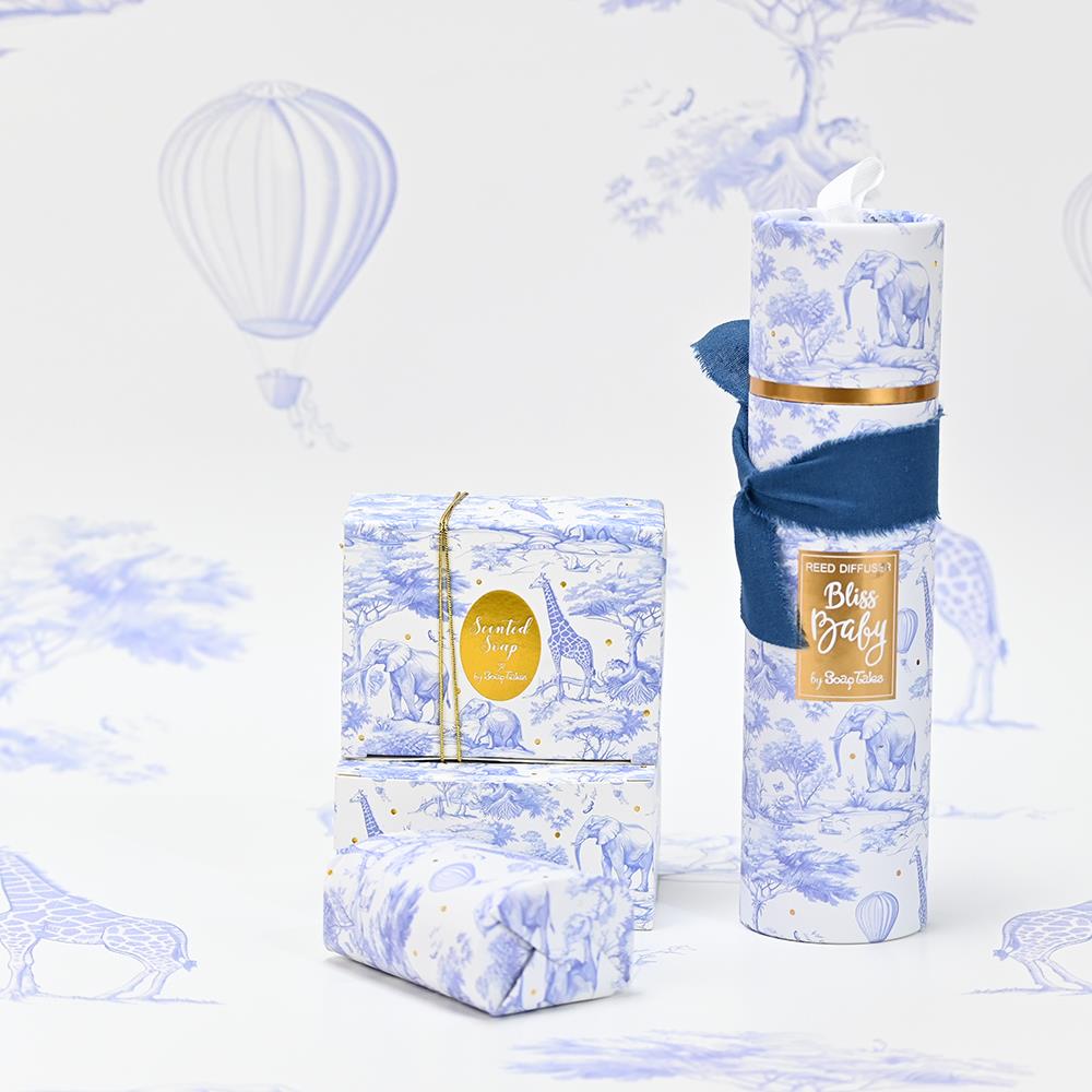 Το μαντίλι είναι προσεκτικά διπλωμένο μέσα σε χαρτί αφής με την ίδια εκτύπωση και τοποθετημένο σε πολυτελές κουτί με χρυσές πινελιές. Η σειρά Bliss Baby αποτελεί την exclusive πρόταση της SoapTales για μπομπονιέρα βάπτισης, αλλά και για ένα μοναδικό δώρο που ξεχωρίζει.