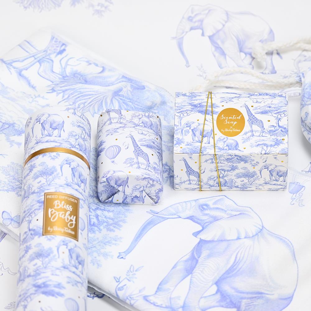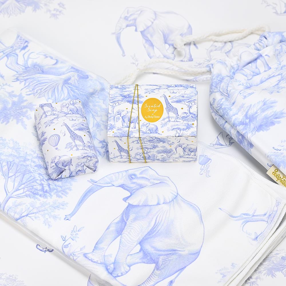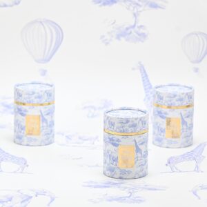 Η συσκευασία του, εμπνευσμένη από το αγαπημένο toile de jouy, ντυμένη με γαλάζια ελεφαντάκια, καμηλοπαρδάλεις και balloon motifs, δημιουργεί μια ολόκληρη ιστορία πάνω στην επιφάνεια του κουτιού. Το design αποπνέει ρομαντισμό και παιδική ανεμελιά, ενώ οι χρυσές λεπτομέρειες προσθέτουν μια διακριτική πολυτέλεια που το κάνει ιδανικό και για δώρο.