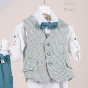Βαπτιστικό κοστούμι Piccolino Carter σε χρώμα Petrol. Περιλαμβάνει καμπυλόγραμμο γιλέκο , πουκάμισο λινό, παντελόνι λινό με πιέτες σε χρώμα Petrol, παπιγιόν, ζωνάκι με double D δέσιμο και καπέλο με φάσα. Διαθέσιμο σε 4 μεγέθη 6-12, 12-18, 18-24, 24-36(εξτρά χρέωση) Επωθεληθείτε την προσφοράς μας και δημιουργήστε ένα ολοκληρωμένο πακέτο βάπτισης που περιλαμβάνει