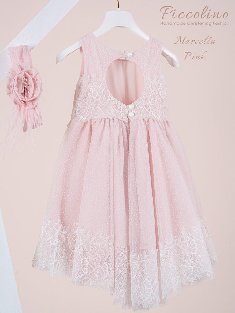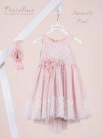 Βαπτιστικό φόρεμα Piccolino Beatrice Puce. Φόρεμα με διπλή δαντέλα , στο εσωτερικό του φορέματος υπάρχει ανάγλυφη δαντέλα που ξεπροβάλλει από το άνοιγμα στη μέση της φούστας και από πάνω της πέφτει η δαντέλα με τις ψιλές μαργαριτούλες. Μπούστο απο δαντέλα με λαιμόκοψη σε σχήμα καρδιάς. Ασύμμετρη τούλινη φούστα μακρυά πίσω. Διακριτικό δαντελένιο ζωνάκι. Το ντεκόρ του φορέματος αποτελείται απο χειροποίητα λουλούδια και μαραμπού. Το φόρεμα συνοδεύεται απο κορδέλα με ντεκόρ όμοιο με το φόρεμα Διαθέσιμο σε 4 μεγέθη: 6-12, 12-18, 18-24, 24-36(εξτρά χρέωση) Υπάρχει η δυνατότητα να σετάρουμε