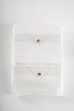 Λαδόπανα βάπτισης Ιθάκη | Ithaca από την εταιρία Lina Baby Απλό και κομψό βαμβακερό σετ  λαδόπανων σε λευκό χρώμα με δαντέλα τύπου βελονάκι, ντεγκραντέ τρέσα σε χρωματισμούς του απαλου Γκρί, Ιβουάρ  και Λευκού. Στην μέση της δαντέλας ενα διακριτικό  φιογκάκι περασμένο σε λευκή χάντρα. Το σετ περιλαμβάνει, πετσέτα μεγάλη, λαδόπανο, μικρή πετσέτα και εσώρουχα. • Πετσέτα 100% βαμβακερή διαστάσεων 90*140*450g. OEKO-TEX STANDARD 100 • Πετσέτα παπά 100% βαμβακερή διαστάσεων ραμμένη 30×50 Υπάρχει η δυνατότητα γραφής του ονόματος του παιδιού με κέντημα, ίδιων αποχρώσεων με το λαδόπανο με έξτρα χρέωση. Με κέντημα ενός ονόματος +20ευρώ. Με κέντημα δύο ονομάτων +30ευρω.